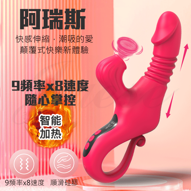 阿瑞斯 9段伸縮x8速吮吸蜜豆外撩液顯USB充電式加溫按摩棒-紅色