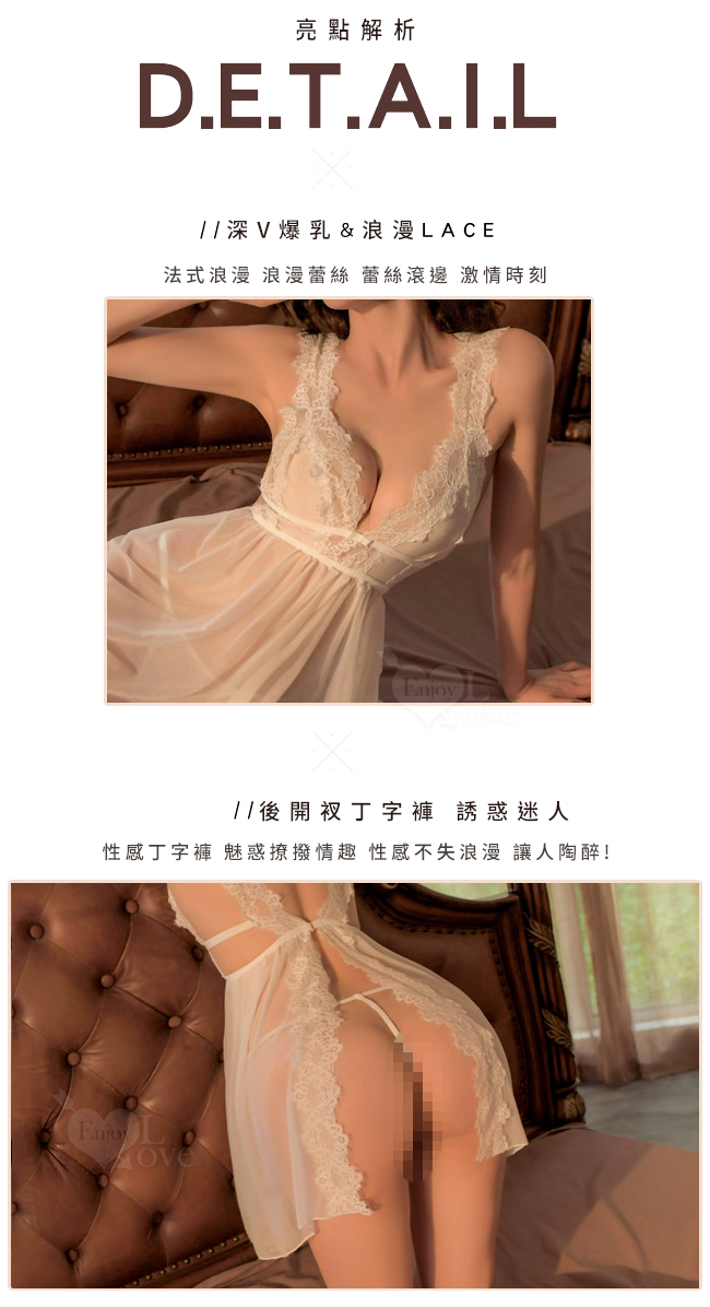 | 《 Enjoy Love 》情趣睡衣!寬版蕾絲雙彈力帶側鏤空後開襟連身裙兩件組﹝白﹞