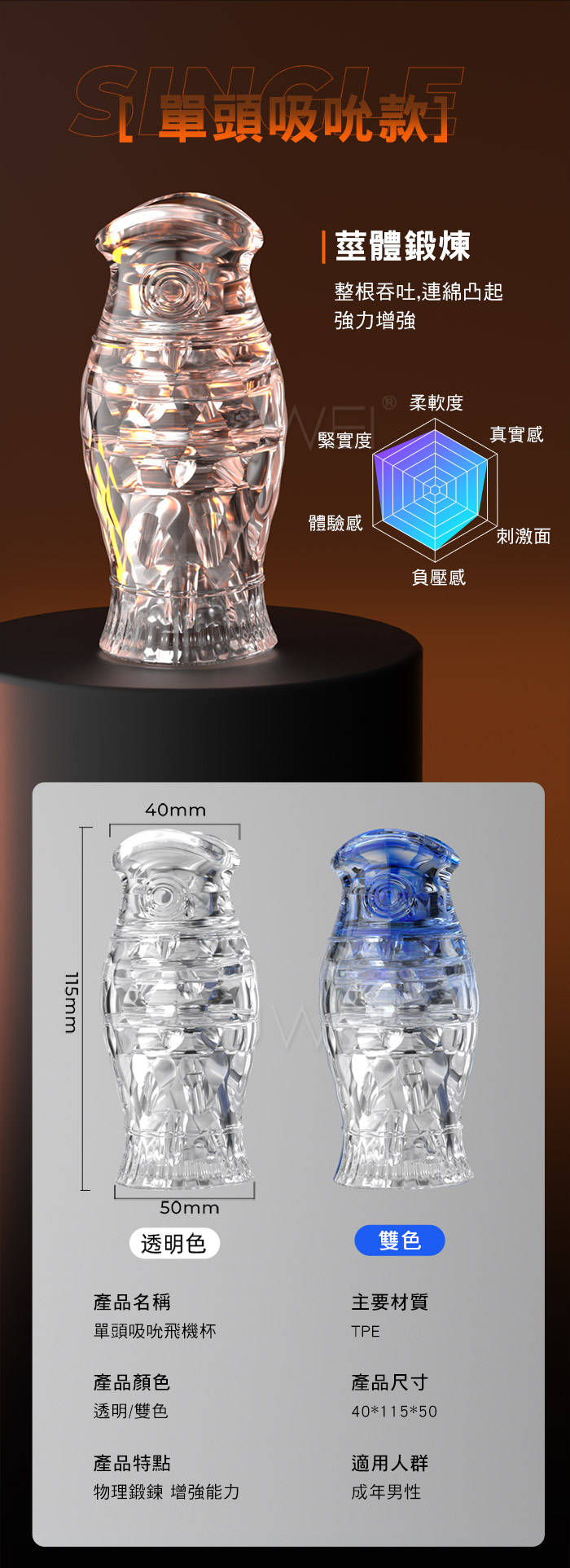 | PHYSICAL EXERCISE強化訓練.單頭吸吮莖體鍛煉飛機杯- 透明