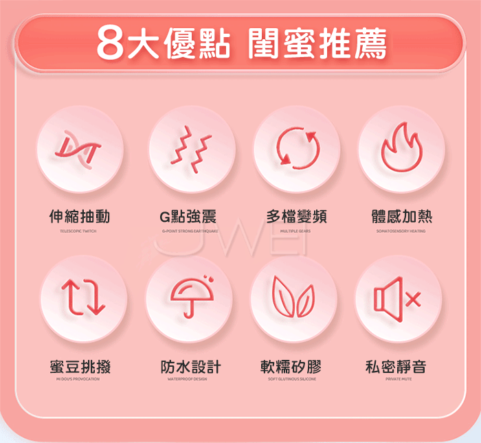■特色: 7頻伸縮、12頻「震動、拍打、吸吮」、生活防水、智能加溫
