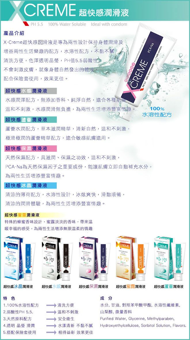 X-Crème超快感潤滑液是專爲兩性設計保持身體潤滑及增益兩性生活樂趣的配方,水溶性配方、不黏不腻、清洗方便;色澤透明晶瑩;PH值5.5弱酸性,不會刺激皮膚,就像身體自然發出的體液。配合保險套使用,效果更佳。