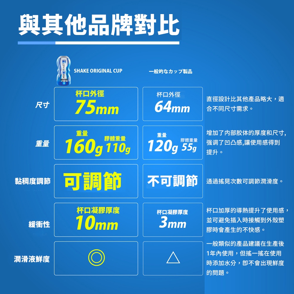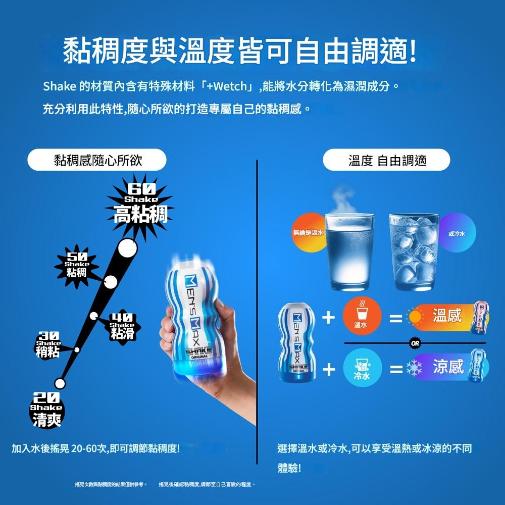 種類:非貫通 材質:矽膠+塑料 包裝:收縮膜包裝 產地:中國 商品尺寸:長15.5cm、寬7.3cm、總重量160g SHAKE「旋轉吸附」控制飛機杯,加水越搖越潤滑 加水後,越搖越黏稠,黏稠感隨心所欲! 搖晃20次...清爽 搖晃30次...稍黏 搖晃40次...黏滑 搖晃50次...黏稠 搖晃60次...高黏度 「旋轉式」吸附控制,通過旋轉頭部轉盤,控制吮吸強度及鬆緊程度 真空製造能力MAX!!隨著通道收緊,享受連綿起伏的刺激感!! 柔軟的矽膠和氣流變化帶來強力吮吸快感!
