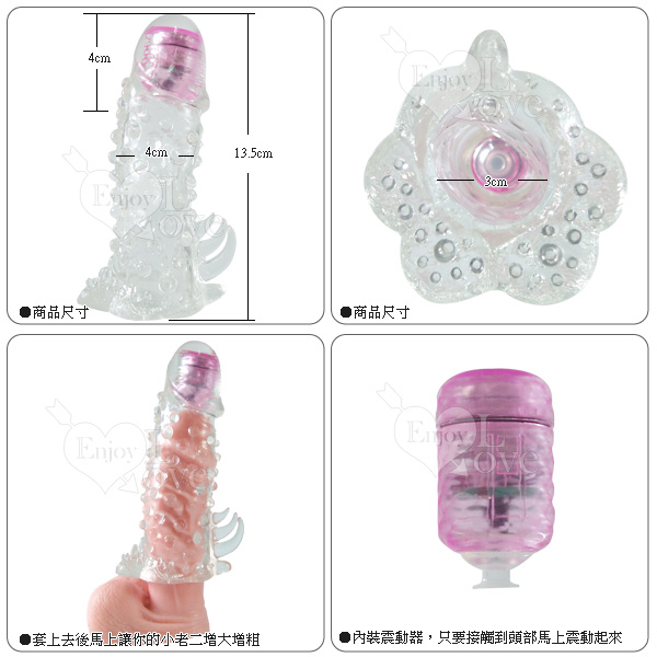 新開發產品,套前4公分內裝有震動器,有一觸動點,只要接觸到它,頭部馬上震動起來,可讓男女在抽送當中,隨動作雙雙享受震動快感。